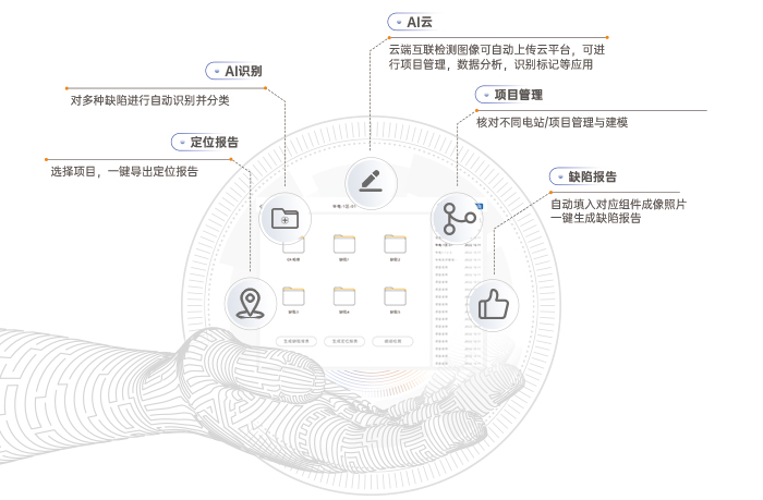 云平臺軟件功能:組件條碼掃碼錄入,截圖,增益,圖片標記,圖片矯正,Ai披露跑圖識別,電站建模,定位消缺等功能